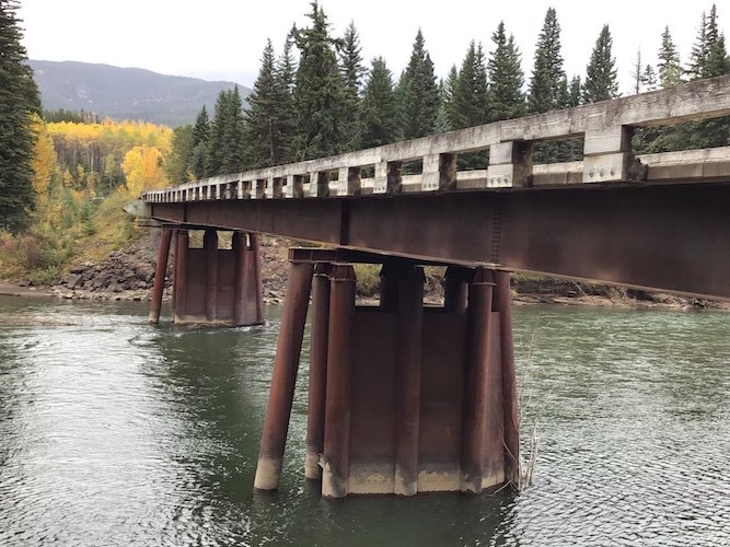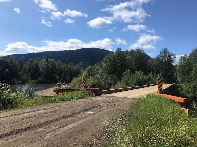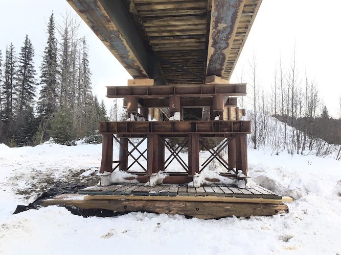 In the spring of 2017, construction started on the replacement of a “bridge” consisting of several beams that were not secured to another to maintain access to the River Water Pumphouse near Taylor B.C.. This structure was not built to any known standards or codes and not classified as a bridge to a professional, therefore it could not be given a load rating. The replacement bridge (12.192m or 40ft.) was manufactured as a low-profile one-piece structure to save on road height approach due to tight site constraints. The old sets of beams were removed, the substructure was re-set by compaction and placement of a spread mat foundation followed. This bridge was replaced quickly by transporting the completed bridge to site and lowering it in place where the old one was, leaving only a small amount of fill to be used for the bridge approaches due to its shallow beam depths. The project was completed successfully within a couple days and all construction documentation was recorded by Trilogy Crossing Corp.