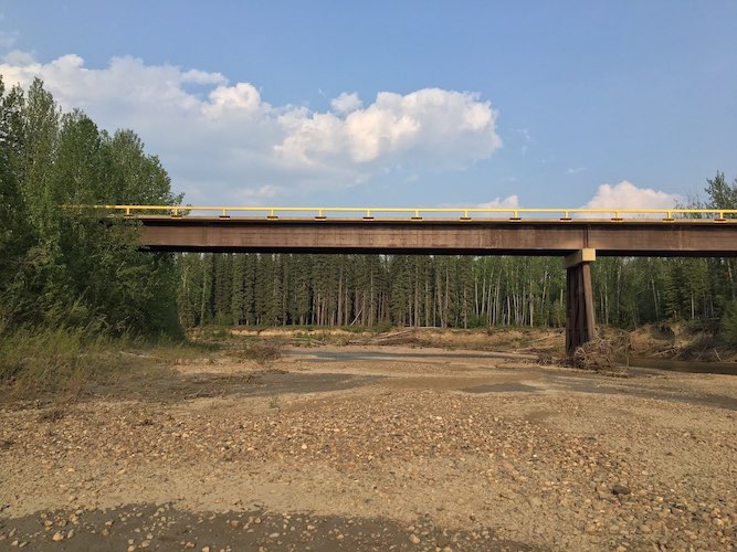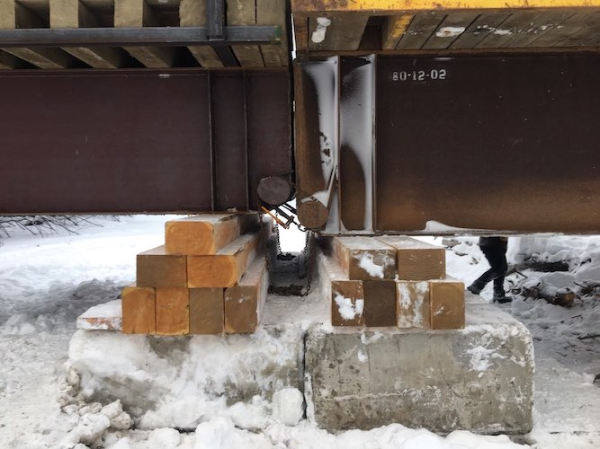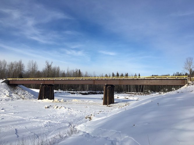 In December of 2017 access was required to the other side of a large sized river for winter logging activities. Trilogy Crossing Corp. did a survey to create a bridge plan and determine the smallest bridge length required to span the frozen creek without impacting the water/ice. The solution was a set of 3 temporary spans (30.48m, 30.48m, 15.24m or in imperial 100ft., 100ft., and 50ft.) with each pier set on gravel bars in the river. One of the piers consisted of an arrangement of lock-blocks interlocked with one another set on mats below to distribute the heavy weight of logging trucks, and another consisted of a pre-assembled steel pier cap that could be lifted into position as once piece. These piers effectively took loaded logging truck loads from the bridge and distributed them into the ground around the ice. The bridge was successfully used for the duration of frozen conditions and disassembled before spring without impacting the creek.