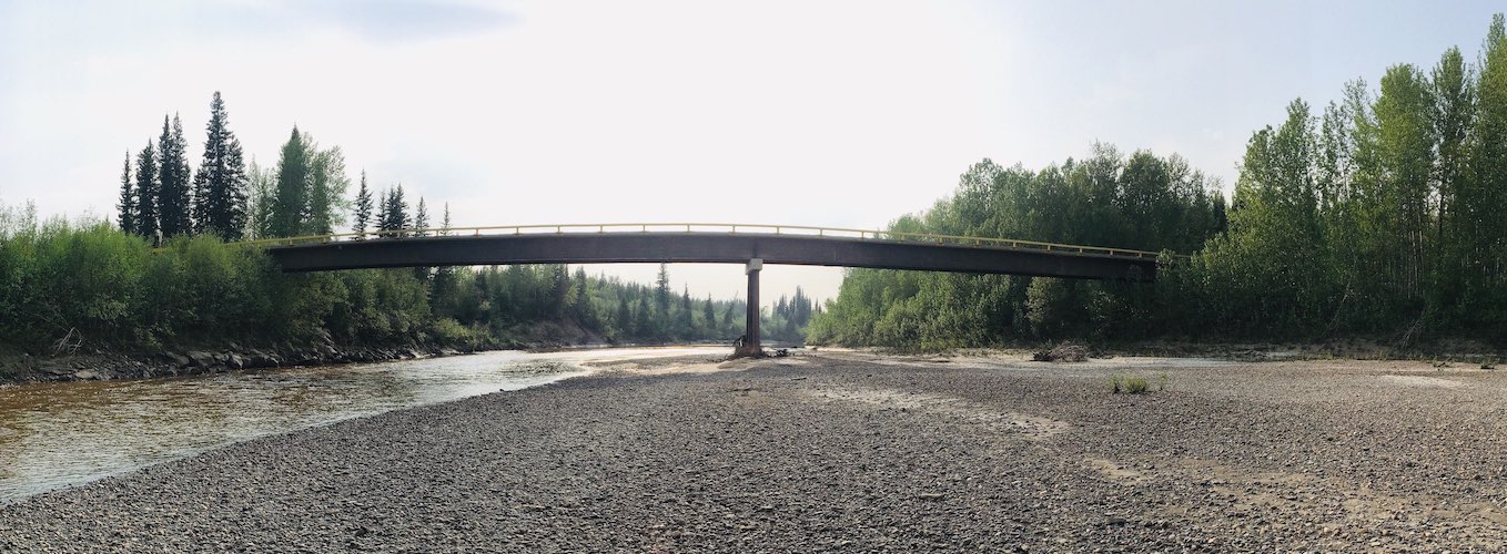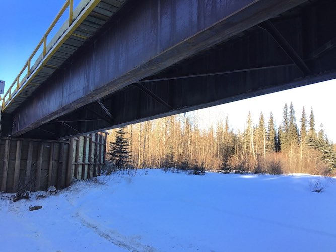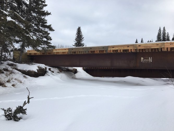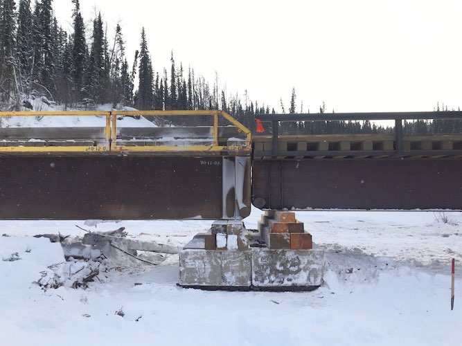 In December of 2017 access was required to the other side of a large sized river for winter logging activities. Trilogy Crossing Corp. did a survey to create a bridge plan and determine the smallest bridge length required to span the frozen creek without impacting the water/ice. The solution was a set of 3 temporary spans (30.48m, 30.48m, 15.24m or in imperial 100ft., 100ft., and 50ft.) with each pier set on gravel bars in the river. One of the piers consisted of an arrangement of lock-blocks interlocked with one another set on mats below to distribute the heavy weight of logging trucks, and another consisted of a pre-assembled steel pier cap that could be lifted into position as once piece. These piers effectively took loaded logging truck loads from the bridge and distributed them into the ground around the ice. The bridge was successfully used for the duration of frozen conditions and disassembled before spring without impacting the creek.