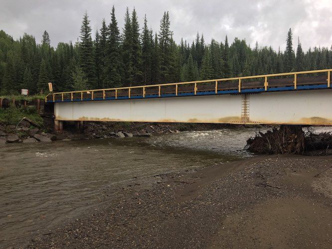 In the spring of 2017, construction started on the replacement of a “bridge” consisting of several beams that were not secured to another to maintain access to the River Water Pumphouse near Taylor B.C.. This structure was not built to any known standards or codes and not classified as a bridge to a professional, therefore it could not be given a load rating. The replacement bridge (12.192m or 40ft.) was manufactured as a low-profile one-piece structure to save on road height approach due to tight site constraints. The old sets of beams were removed, the substructure was re-set by compaction and placement of a spread mat foundation followed. This bridge was replaced quickly by transporting the completed bridge to site and lowering it in place where the old one was, leaving only a small amount of fill to be used for the bridge approaches due to its shallow beam depths. The project was completed successfully within a couple days and all construction documentation was recorded by Trilogy Crossing Corp.